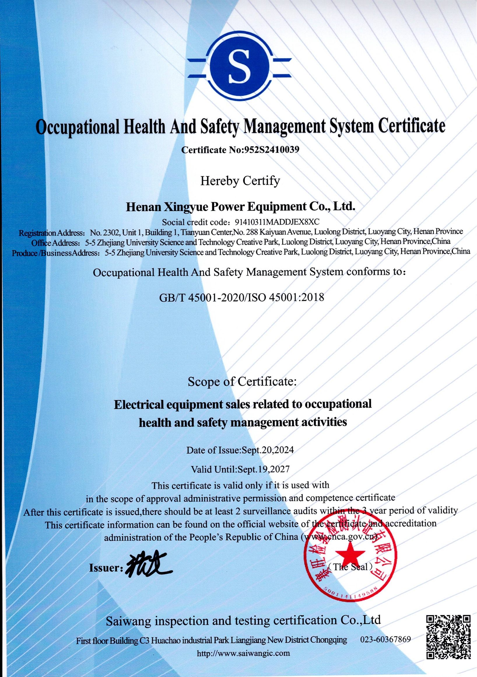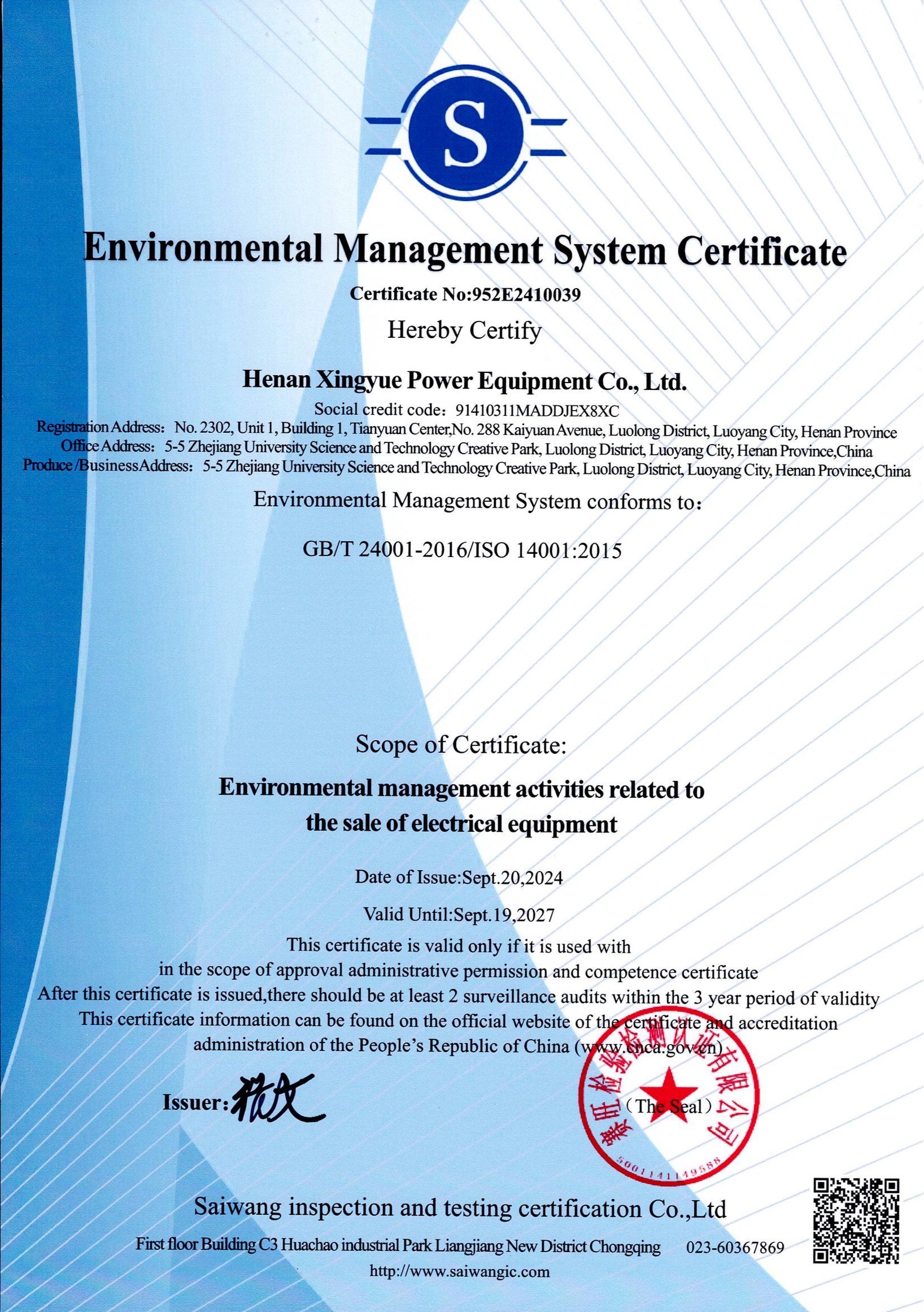 SGS и другие национальные обязательные сертификаты продукции, а также имеет безупречную систему сертификации систем менеджмента качества, охраны труда и окружающей среды. Наша продукция прошла сертификацию ISO9001, 2000 и других международных систем качества.
